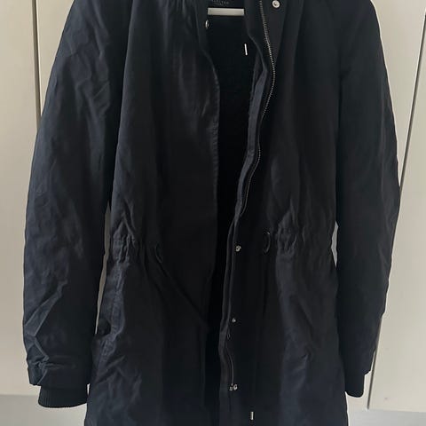 Selected Femme jakke til kvinder i str. L. Jakken er beige og fremstillet i polyester. Den har dobbeltknaplukning foran, bindebælte i taljen og lange ærmer. Designet er kortere end en frakke og egner sig som overgangsjakke eller let yderjakke i hverdagen.
