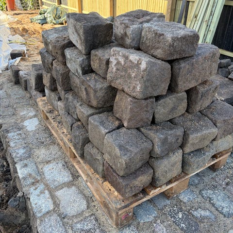 Brosten til udendørs belægning i grå granit. Stenene er små kvadratiske granitsten, velegnede til indkørsel, gårdsplads, gangarealer eller terrasse. Belægningen kan lægges i buemønster eller lige forbandt, som vist på billederne. Egner sig til områder med person- og biltrafik afhængigt af underlag og opbygning. Sælges som brugte brosten, der kan optages og genanvendes til ny belægning.