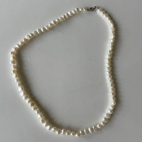 Ferskvandsperlekæde i hvid farve. Kæden består af runde perler i ensartet størrelse og lukkes med en metal-lås. Velegnet som klassisk smykke til hverdag eller fest.