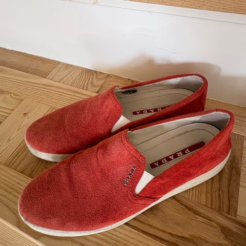 Prada loafers i ruskind i størrelse 39. Skoene er i en beige/nude farve med elastiske kiler i siderne for lettere påtagning. Overdel i blødt ruskind og lys gummisål med Prada-logo på sålen og indersålen. Velegnet som casual hverdagssko eller let sommersko.