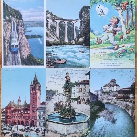 Topografiske motiver og smukke landskaber fra: Aarau kirke, Zermatt ved Matterhorn, Schaffhausen Munot fæstning, Territet-Gilon-Caux panorama, Bern verdenspost statue, og Liestal port. 6 smukke postkort, mere end 100 år gamle.