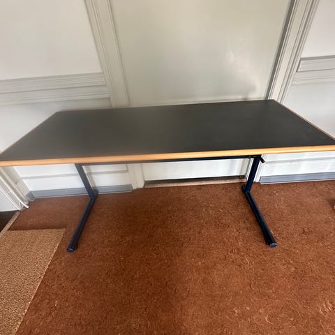 Skrivebord lysgrå bordplade med sort stel og kabelgennemføring