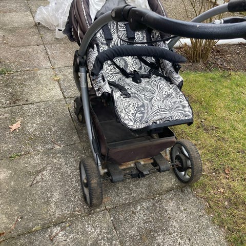 Barnevogn i rød farve med tilhørende lift. Vognen har drejelige forhjul og større baghjul. Der medfølger en løs del, som kan anvendes som lift eller kørepose. Egnet til spædbørn og småbørn til brug på gåture og transport. Vognen har håndtag og opbevaringsmulighed under sædet til mindre ting.