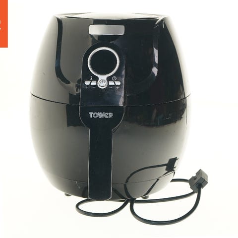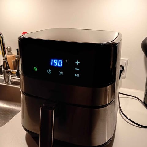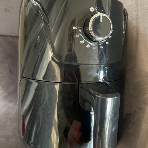 Der medfølger også en sort airfryer fra Point med udtræksskuffe og håndtag foran. Airfryeren er beregnet til tilberedning af mad med varm luft i en lukket kurv. Begge apparater er beregnet til brug på køkkenbord og tilsluttes med almindelig strømstik.