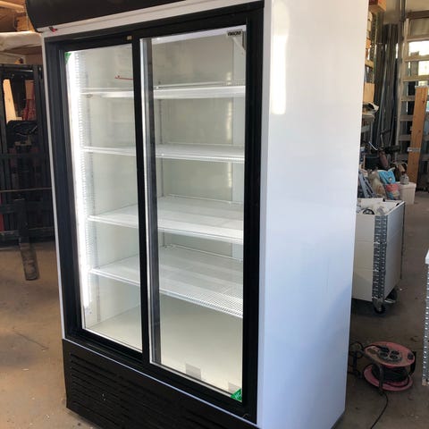 Simfer køleskabe med glaslåger til opbevaring og fremvisning af kolde drikkevarer eller fødevarer. Skabet har flere justerbare hylder og indvendig belysning, så indholdet er synligt for kunder. Fronten er udført med glaslåger og sort ramme, og der er mekanisk temperaturstyring indvendigt. Egnet til brug i café, butik eller andre erhvervsmiljøer, hvor der er behov for kølig opbevaring og præsentation af varer.