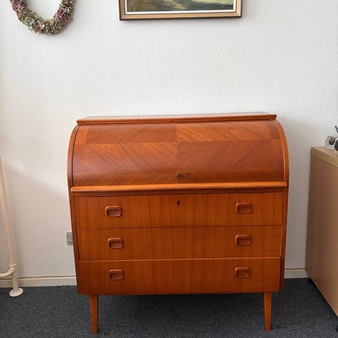 Super fin Retro Kommode i teaktræ , med 4 skuffer i brun finish. Kommoden har runde udskårne greb på skufferne . Indvendigt har skufferne glatte flader uden inddelinger.