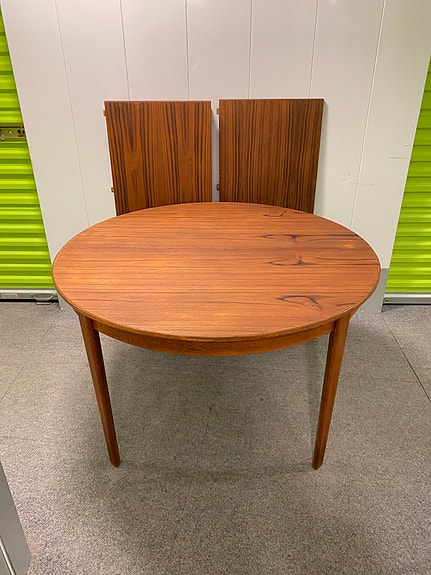 Skovmand. Lækker rundt spisebord i taek med udtræk, to tillægsplader. H. 73 cm. Tillægsplader 50 cm. Spisebord med plader totallængde 220 cm. Fremstår i super stand. Evt kan lev aftales