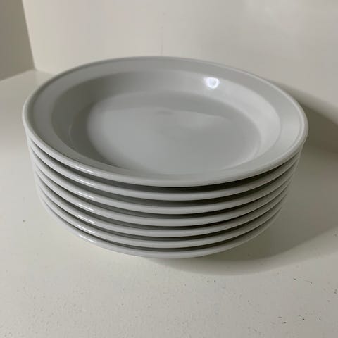 Royal Copenhagen låg eller sidetallerkener i porcelæn. Hvis med dekoration i brune nuancer langs kanten og små prikmotiver. Tallerkenerne er af mærket Domino, med Royal Copenhagen stempel og malersignatur under bunden. Prisen er pr. stk.