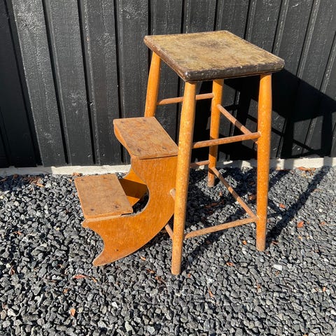 Lille skammel i træ i brun naturfarve. Skamlen har rektangulær siddeflade med udskåret håndtag i midten, hvilket gør den nem at flytte rundt. Konstruktionen består af solide træplanker med synlige samlinger. Velegnet som ekstra siddeplads, fodskammel eller lille afsætningsflade i fx stue, køkken eller entré.