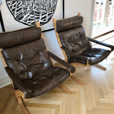 Høj model af Siesta designet af Ingmar Relling. Man sidder rigtig godt i den, og samtidig udstråler den et let design. Stolen er fra 60' erne og fremstår med tilsvarende patina.