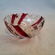 Glas i rød / cerise krystal med klar stilk og fod. Glasset har slebet, dekorativt mønster rundt om bowlen og i bunden.