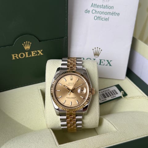 Rolex Datejust 116243. Det populære datejust i guldstål 36 mm med den skjulte lås. Denne model er noget helt særligt, da det er 43-udgaven som er født med diamantkrans fra Rolex og kombineret med den flotte champagne skive med diamanter er det virkelig en sjælden model. Kommer med boks og papirer fra 2012.