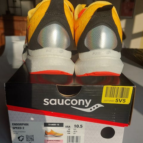 Saucony Endorphin Pro 2 løbesko i størrelse 42,5 (27 cm) . Hurtig konkurrencesko med indbygget carbonplade i mellemsålen for at gøre skoen mere effektiv og lydhør. Med let overdel i åndbart mesh i orange farve. Virkelig en lækker og meget let sko. Brugt meget lidt - ca. 15-20 km på løbebånd, så der er masser af go i den endnu. Nypris kr. 1.550.