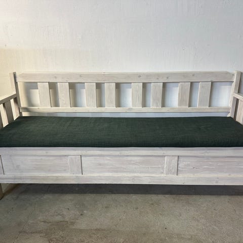 Gammel slagbænk med stort opbevaringsrum. Maling er skalle af som ses på billede. Derfor 1200kr. Mål: 47 sh 55 dyb 181 l 101 høj ryg.