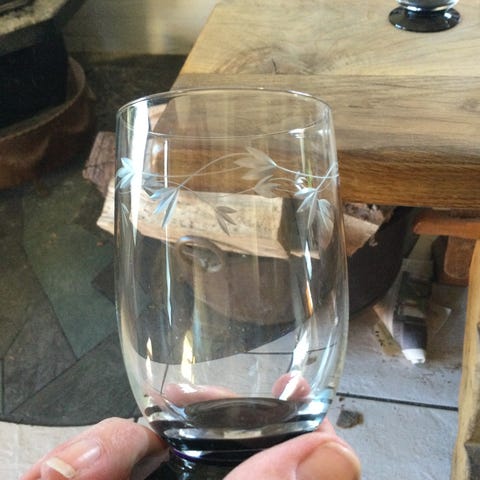 Glas med sort fod og druegraveret mønster