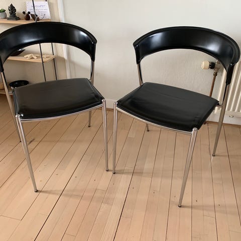 2 elegante spisebordsstole i sort læder med slankt kromstel.