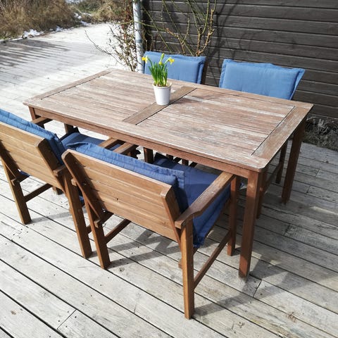 Pænt havesæt med bord og 4 stole. I massiv træ. Trænger til lidt kærlighed (slib og olie), men fejler ellers ikke noget.