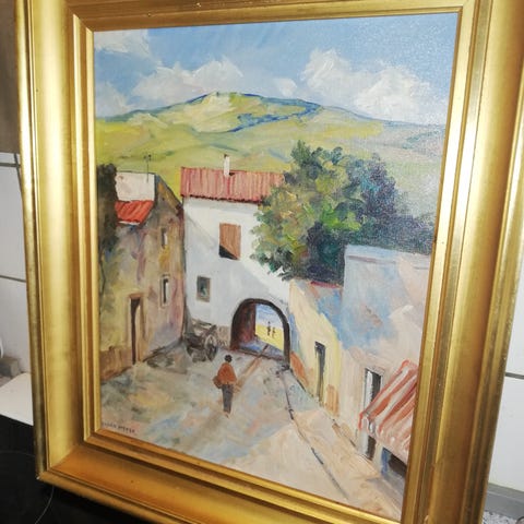 Oliemaleri af Jacob Meyer ( 1895-1971) med motiv af italiensk landskab med et hus ved en sø og bjerge i baggrunden. Billedet viser et lyst hus med rødt tag. Maleriet er indrammet i en klassisk, gylden træramme. Velegnet som vægdekoration i stue, gang eller sommerhus.