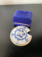 Porcelæn, Sennepskrukke nr 137, Royal Copenhagen 1889–22, Knoppen på låget er gået i stykker og en lille revne på hanken
