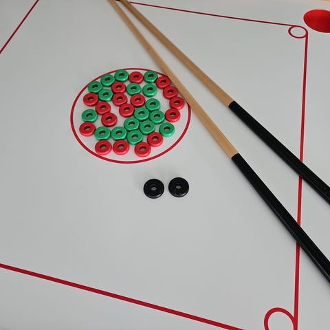 15 røde, 15 grønne og 2 sorte brikker/sten.