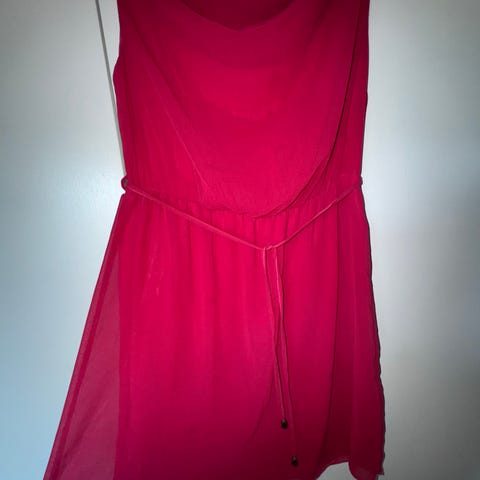 fest/cocktail kjole til kvinder i str. M. Kjolen er rød og fremstillet i polyester. Modellen har lange ærmer i let transparent materiale med prikket struktur, rund halsudskæring og dekorative flæsedetaljer foroven. Skørtet er langt med flere lag og flæser i samme prikkede stof. Der medfølger bindebånd i taljen i matchende farve og materiale. Egnet til festlige anledninger.