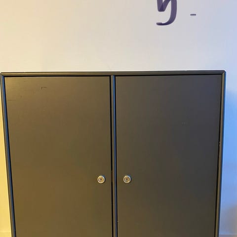 Montana skab designet af Aage Petersen. Skabet har to låger med greb på fronten og en enkel, rektangulær form. Egnet til opbevaring i for eksempel stue, kontor eller entré. Neutralt, mørkt kabinet, der kan indgå i forskellige indretningsstile.