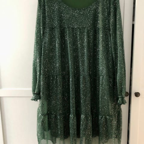 Grøn kjole med guldprikker med langt ærme - tyl med underkjole str 2XL