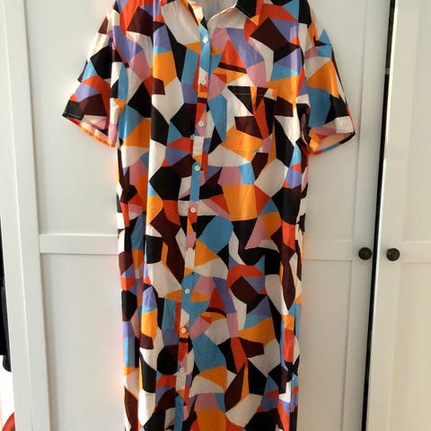 Skjortekjole med kort ærme gennemknappet i orange/ blå/hvide farver
