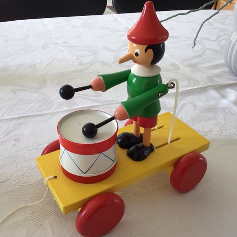 Antik mekanisk legetøjsfigur formet som en trommeslager klovn. Figuren er udført i metal med optræksnøgle på ryggen og bevægelige arme med trommestikker. Klovnen har malet ansigt, blå jakke og ternede bukser. Egnet som samlerobjekt eller dekoration. Ca 11,5 cm høj. Fungerer perfekt.