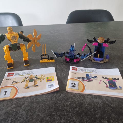 LEGO Ninjago byggesæt med rød mech-robot, blå robotfigur og tilhørende minifigurer. Sættet indeholder en større rød mech med sværd og skjold, en mindre blå robot samt flere Ninjago-minifigurer med våben og udstyr. Der medfølger trykt byggevejledning, som viser, hvordan modellerne samles. Velegnet som samlesæt og til leg i Ninjago-universet.