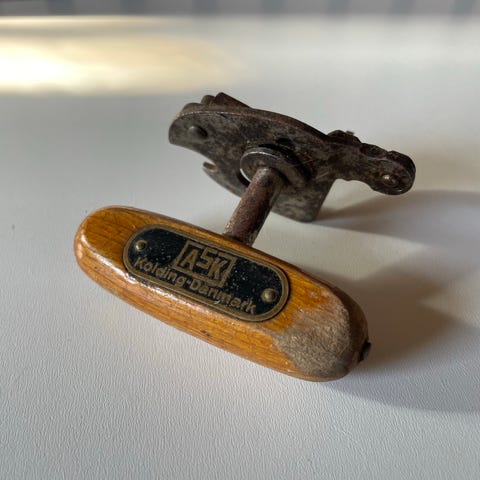 Der er indgraveret tekst rundt om motivet. Klassisk, flad model der kan bruges til at åbne kapsler på flasker.