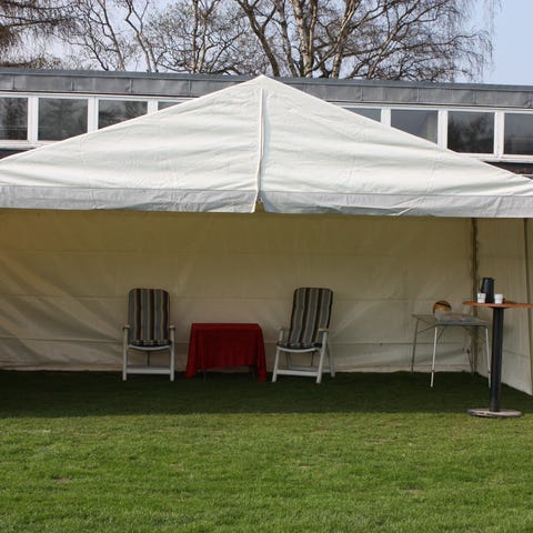 Teltet er i pæn stand. Dugen er i meget kraftig kvalitet, stængerne firkantrør. Et robust kvalitetstelt.