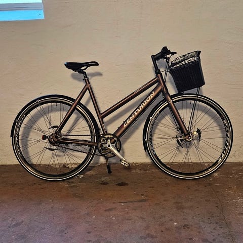 Centurion Basic hybridcykel i unisex-udgave med 28" hjul. Cyklen har let skrå dame/herre-ramme i mellemstørrelse (M) og lige styr. Udstyret med bagagebærer, skærme og fodbremse bag samt håndbremse foran. Velegnet til daglig transport og pendling i byen.