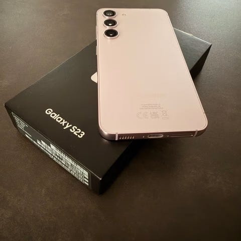 Samsung Galaxy S23 smartphone med 128 GB intern hukommelse. Enheden fremstår i sort farve og har tredobbelt kamera på bagsiden. Der medfølger original æske og et gennemsigtigt beskyttelsescover, som ses på billederne. Velegnet til almindelig brug som opkald, beskeder, internet og apps.