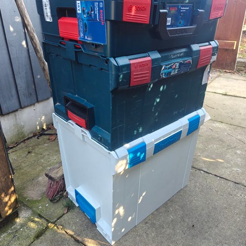 Raaco opbevaringskasser med indsatsrum i plast. Sættet består af kasser i blå plast med transparente låg og bærehåndtag. Indvendigt er der faste plastindsatser med flere rum, velegnet til sortering og opbevaring af smådele som skruer, beslag eller andre mindre komponenter. Kasserne kan stables og har låsemekanismer på forsiden. Velegnet til værksted, hobbyrum eller anden systematisk opbevaring af småting.