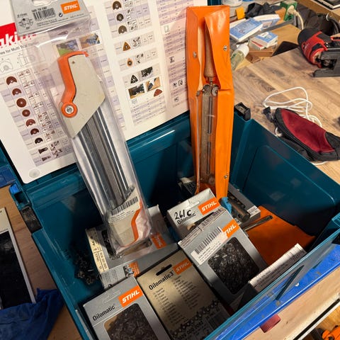 2stk sthil Motorsave med skulptur sværd og en del kæder model 170 og model 271. Brugt flittigt og løbende vedligeholdt. Der følger en del kæder med. 1 stk cnc fodbetjent Tømmerklo og et par skærebukser. Sælges kun samlet. Et påspændings plankesavværk kan med købes for 1000,- ekstra