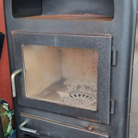 Bortgives. Den har skorstensåbning bagtil, men kan ændres til top hvis ønskes. Der skal skæres en ny sten til brændkammeret, den knækkede sten følger med som skabelon. Alder ukendt.