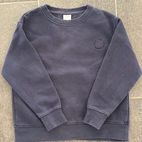 Råhvid Zara sweatshirt med blåt og orange print. Fra røg- og dyrefrit hjem.