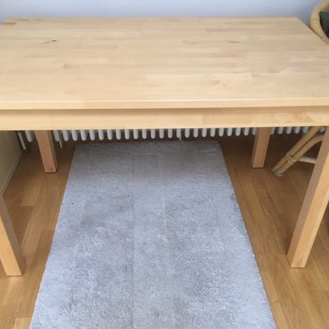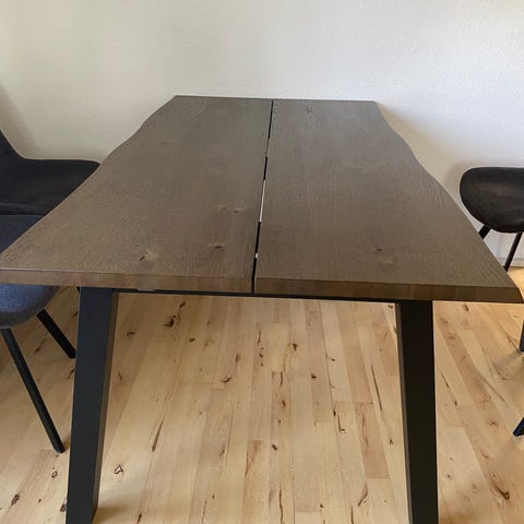 Spisebord i rektangulær form med bordplade i lyst træ (laminat) og sorte ben. Bordet står på fire skråtstillede metalben, som giver et let og moderne udtryk. Velegnet som spisebord i køkken eller spisestue til flere personer. Overfladen har synlig træstruktur.