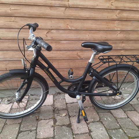 Pigecykel med 20" hjul i lyseblå farve. Cyklen har bagbagagebærer samt fastmonteret frontkurv. Udstyret med kædeskærm, skærme over begge hjul, støtteben, lås og reflekser. Egnet til børn cirka 6-8 år.