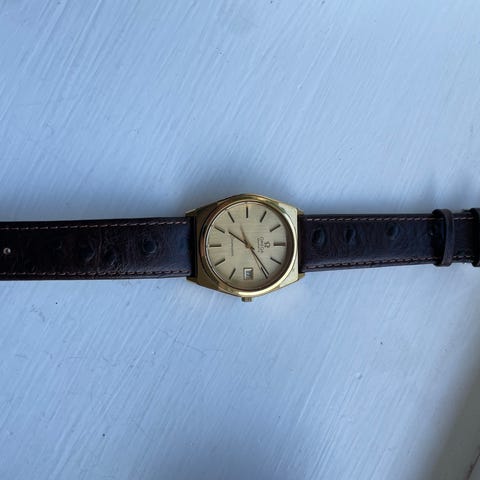 Omega herreur med guldfarvet urkasse og sort læderrem