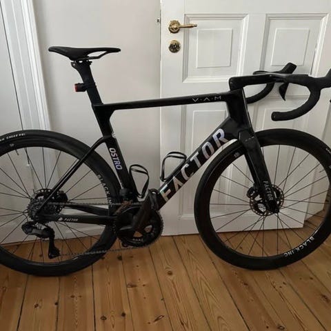 Factor O2 VAM i størrelse 56. Factors topmodel, og en ekstremt let klatrecykel designet til top performance på stigningerne.