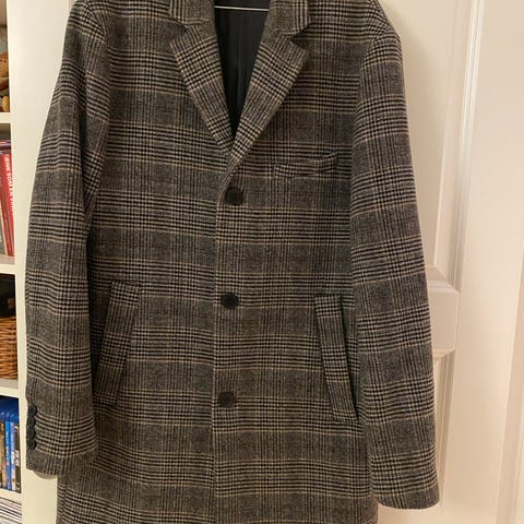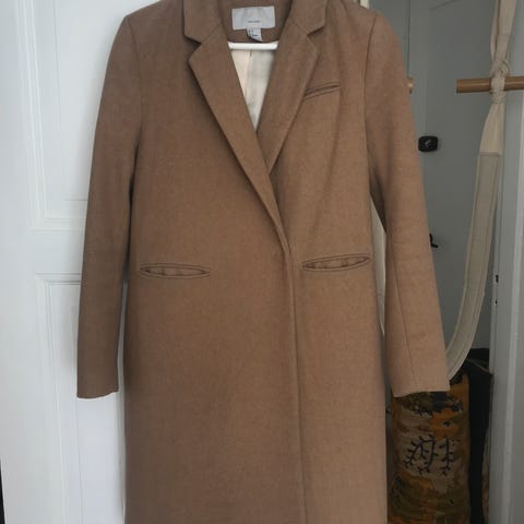 frakke til damer i str. M. Frakken er beige og fremstillet i uldmateriale. Den har bindebælte i taljen og er knælængde med lange ærmer. Enkel, åben front uden synlige knapper. Velegnet som overtøj i overgangs- og køligere vejr.