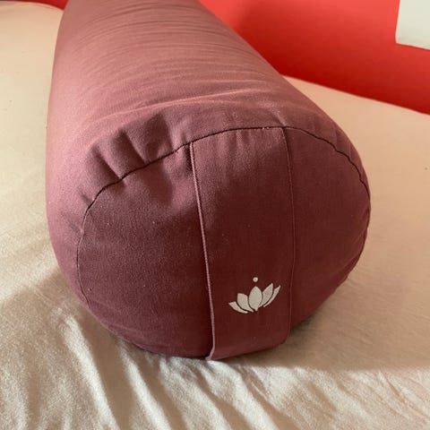 Med fyld af 'spelt husks'. https://prolana.com/da/products/yoga-meditation-cushion-round