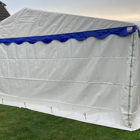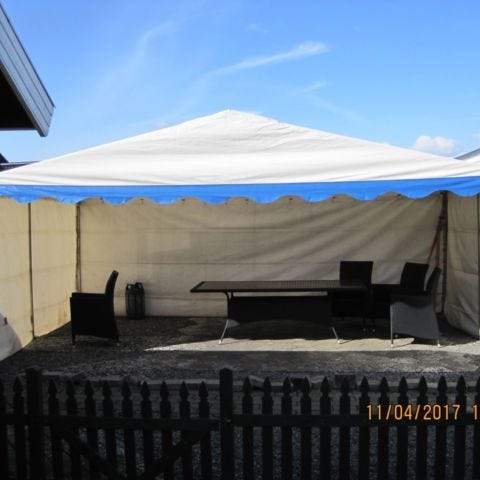 Teltet er i pæn stand. Dugen er i meget kraftig kvalitet, stængerne firkantrør. Et robust kvalitetstelt.