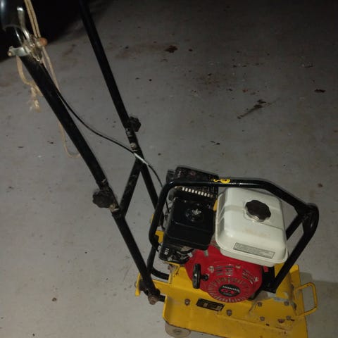 Pladevibrator benzindrevet i gul/sort. Maskinen har håndtag med bøjlegreb og transporthjul bagtil, som gør den lettere at flytte. Egnet til komprimering af belægningssten, grus og sand ved anlæg af indkørsler, terrasser og stier. Drevet af benzinmotor med snoretræk og beskyttelsesskjold over rem og motor. Velegnet til mindre bygge- og haveprojekter, hvor der er behov for komprimering af underlag.