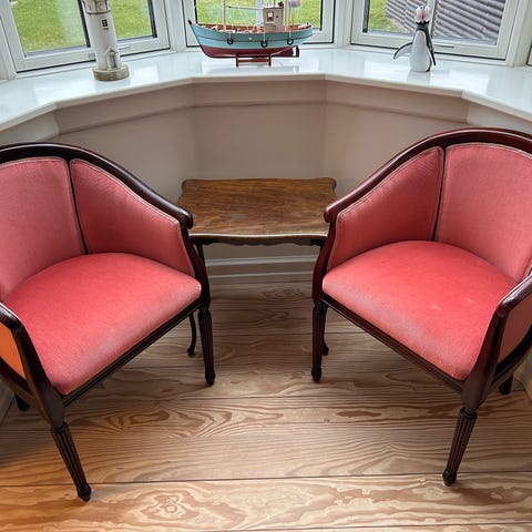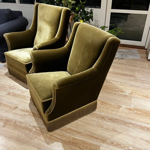 2 ens lænestole i velour i grøn nuance med frynsekant nederst. Stolene har polstrede armlæn og høj ryglæn med knapdetaljer. Egnet som siddeplads i stue eller læsehjørne. Sælges samlet til 150 kr. for begge.