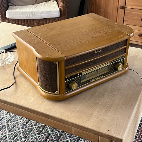 Retro‑musikcenter i klassisk trædesign.