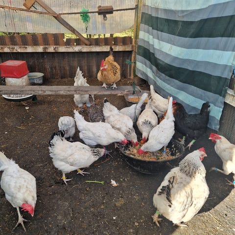 Høns af blandede racer. Flokken består af flere hvide og enkelte brune og mørke høns. De er ca 1 år gamle