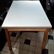 Hvidt spisebord i træ med udtræk og løs tillægsplade. Bordet har profilerede ben og rektangulær bordplade. Udtræksfunktionen gør det muligt at forlænge bordet med den medfølgende plade, så der kan skabes ekstra plads omkring bordet. Velegnet som spisebord i køkken eller spisestue.